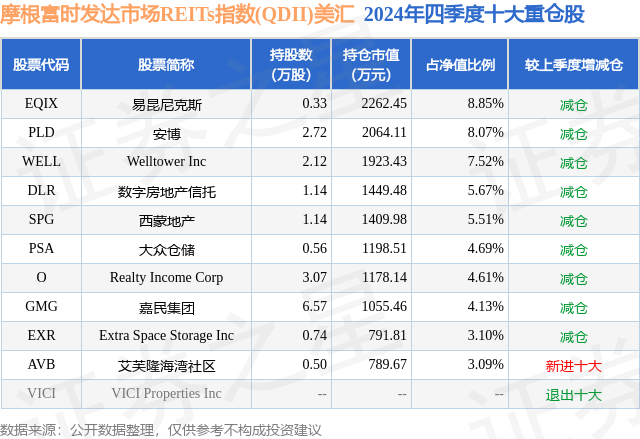 从基金规模来看,摩根富时发达市场REITs指数(QDII)美汇基金2024年四季度公布的基金规模为2.43亿元,较上一期规模2.97亿元变化了-5404.51万元,环比变化了-18.22%。该基金最新一期资产配置为:无股票类资产,无债券类资产,现金占净值比8.78%。从基金持仓来看,该基金当季前十大股票仓位达55.24%,第一大重仓股为易昆尼克斯(EQIX),持仓占比为8.85%。