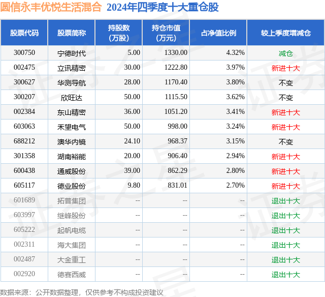 从基金规模来看,圆信永丰优悦生活混合基金2024年四季度公布的基金规模为3.08亿元,较上一期规模3.44亿元变化了-3633.19万元,环比变化了-10.56%。该基金最新一期资产配置为:股票占净值比78.94%,债券占净值比18.65%,现金占净值比2.68%。从基金持仓来看,该基金当季前十大股票仓位达33.95%,第一大重仓股为宁德时代(300750),持仓占比为4.32%。