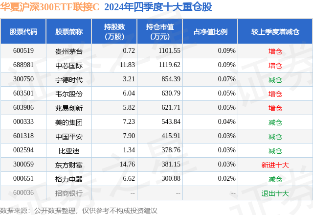 从基金规模来看,华夏沪深300ETF联接C基金2024年四季度公布的基金规模为20.74亿元,较上一期规模24.67亿元变化了-3.93亿元,环比变化了-15.93%。该基金最新一期资产配置为:股票占净值比1.61%,债券占净值比2.83%,现金占净值比2.67%。从基金持仓来看,该基金当季前十大股票仓位达0.5%,第一大重仓股为贵州茅台(600519),持仓占比为0.09%。