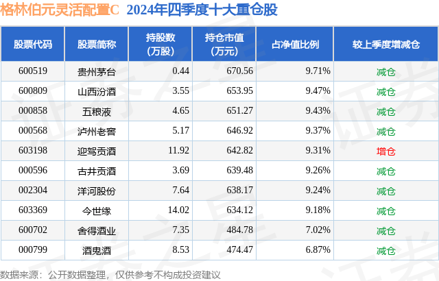 从基金规模来看,格林伯元灵活配置C基金2024年四季度公布的基金规模为0.65亿元,较上一期规模8978.77万元变化了-2448.52万元,环比变化了-27.27%。该基金最新一期资产配置为:股票占净值比94.76%,无债券类资产,现金占净值比8.75%。从基金持仓来看,该基金当季前十大股票仓位达88.86%,第一大重仓股为贵州茅台(600519),持仓占比为9.71%。