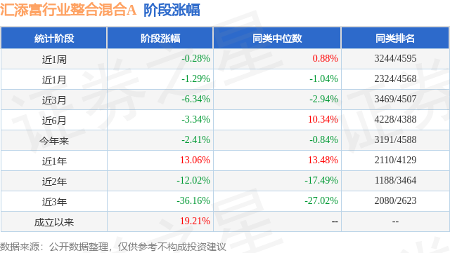 从业绩表现来看,汇添富行业整合混合A基金过去一年净值涨幅为13.06%,在同类基金中排名2110/4129,同类基金过去一年净值涨幅中位数为13.48%。而基金过去一年的最大回撤为-14.39%,成立以来的最大回撤为-55.38%。