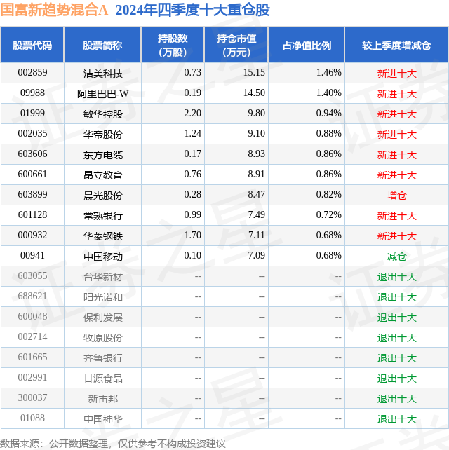 从基金规模来看,国富新趋势混合A基金2024年四季度公布的基金规模为0.02亿元,较上一期规模263.39万元变化了-24.51万元,环比变化了-9.3%。该基金最新一期资产配置为:股票占净值比12.95%,债券占净值比84.11%,现金占净值比2.36%。从基金持仓来看,该基金当季前十大股票仓位达9.3%,第一大重仓股为洁美科技(002859),持仓占比为1.46%。