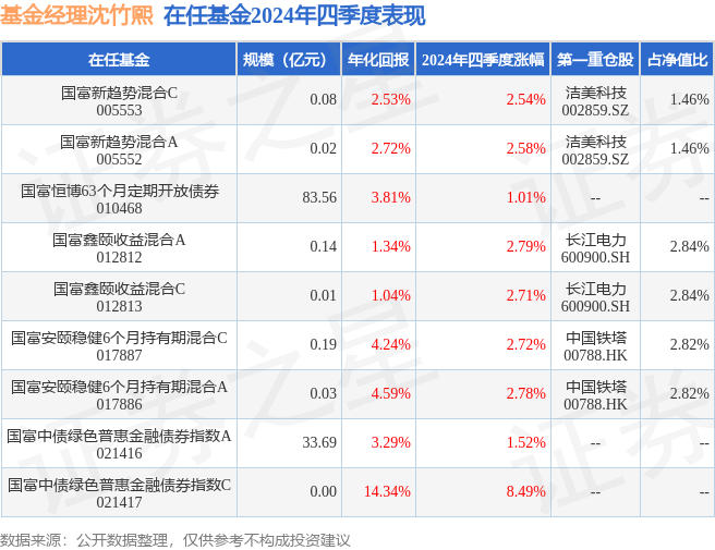 证券之星消息,日前国富新趋势混合C基金公布四季报,2024年四季度最新规模0.08亿元,季度净值涨幅为2.54%。