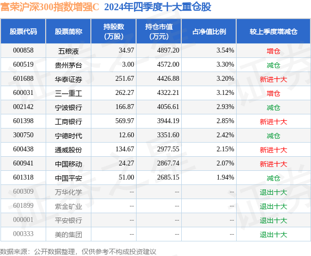 从基金规模来看,富荣沪深300指数增强C基金2024年四季度公布的基金规模为6.02亿元,较上一期规模7.4亿元变化了-1.38亿元,环比变化了-18.68%。该基金最新一期资产配置为:股票占净值比91.27%,债券占净值比5.49%,现金占净值比3.71%。从基金持仓来看,该基金当季前十大股票仓位达27.52%,第一大重仓股为五粮液(000858),持仓占比为3.54%。