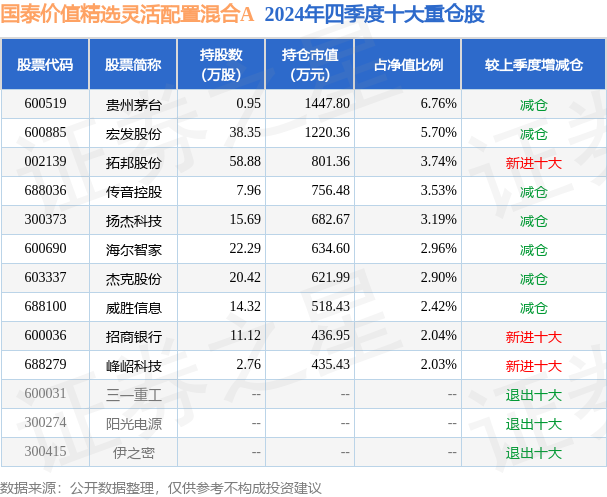 证券之星消息,日前国泰价值精选灵活配置混合A基金公布四季报,2024年四季度最新规模2.13亿元,季度净值涨幅为-4.03%。