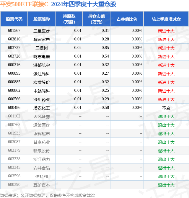 从基金规模来看,平安500ETF联接C基金2024年四季度公布的基金规模为3.06亿元,较上一期规模3.46亿元变化了-4004.41万元,环比变化了-11.57%。该基金最新一期资产配置为:股票占净值比0.01%,无债券类资产,现金占净值比6.15%。从基金持仓来看,该基金当季前十大股票仓位达0.0%,第一大重仓股为三星医疗(601567),持仓占比为0.0%。