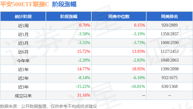 从业绩表现来看,平安500ETF联接C基金过去一年净值涨幅为14.77%,在同类基金中排名1390/2098,同类基金过去一年净值涨幅中位数为18.95%。而基金过去一年的最大回撤为-17.2%,成立以来的最大回撤为-37.49%。