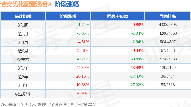 从业绩表现来看,诺安优化配置混合A基金过去一年净值涨幅为44.59%,在同类基金中排名130/4129,同类基金过去一年净值涨幅中位数为13.48%。而基金过去一年的最大回撤为-24.54%,成立以来的最大回撤为-44.16%。