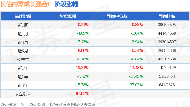 从业绩表现来看,长信内需成长混合E基金过去一年净值涨幅为19.31%,在同类基金中排名1427/4129,同类基金过去一年净值涨幅中位数为13.48%。而基金过去一年的最大回撤为-15.48%,成立以来的最大回撤为-51.46%。