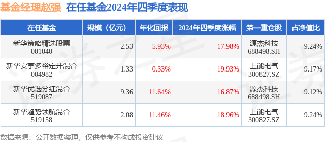 新华安享多裕定开混合现任基金经理为赵强 姚海明。其中在任基金经理赵强已从业8年又308天,2022年10月25日正式接手管理新华安享多裕定开混合,任职期间累计回报为-24.05%。目前还管理着4只基金产品(包括A类和C类),其中本季度表现最佳的基金为新华安享多裕定开混合(004982),季度净值涨幅为19.93%。