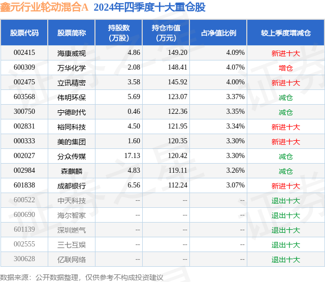 从基金规模来看,鑫元行业轮动混合A基金2024年四季度公布的基金规模为0.24亿元,较上一期规模2566.02万元变化了-154.21万元,环比变化了-6.01%。该基金最新一期资产配置为:股票占净值比76.2%,债券占净值比5.6%,现金占净值比19.23%。从基金持仓来看,该基金当季前十大股票仓位达35.15%,第一大重仓股为海康威视(002415),持仓占比为4.09%。