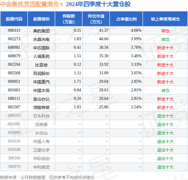 从基金规模来看,中金衡优灵活配置混合A基金2024年四季度公布的基金规模为0.04亿元,较上一期规模283.04万元变化了160.3万元,环比变化了56.64%。该基金最新一期资产配置为:股票占净值比76.91%,无债券类资产,现金占净值比23.35%。从基金持仓来看,该基金当季前十大股票仓位达32.68%,第一大重仓股为美的集团(000333),持仓占比为4.06%。