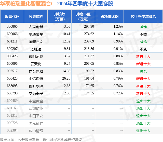 证券之星消息,日前华泰柏瑞量化智慧混合C基金公布四季报,2024年四季度最新规模0.27亿元,季度净值涨幅为0.06%。