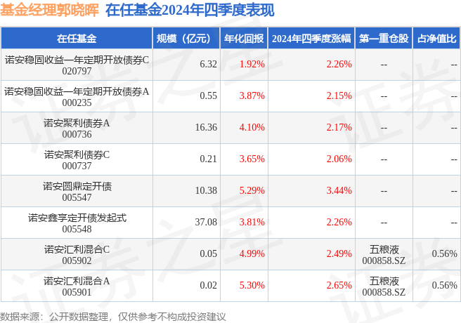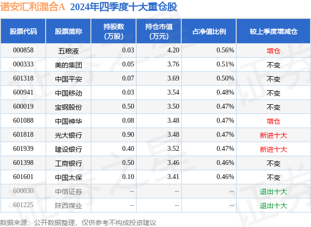 证券之星消息,日前诺安汇利混合A基金公布四季报,2024年四季度最新规模0.02亿元,季度净值涨幅为2.65%。
