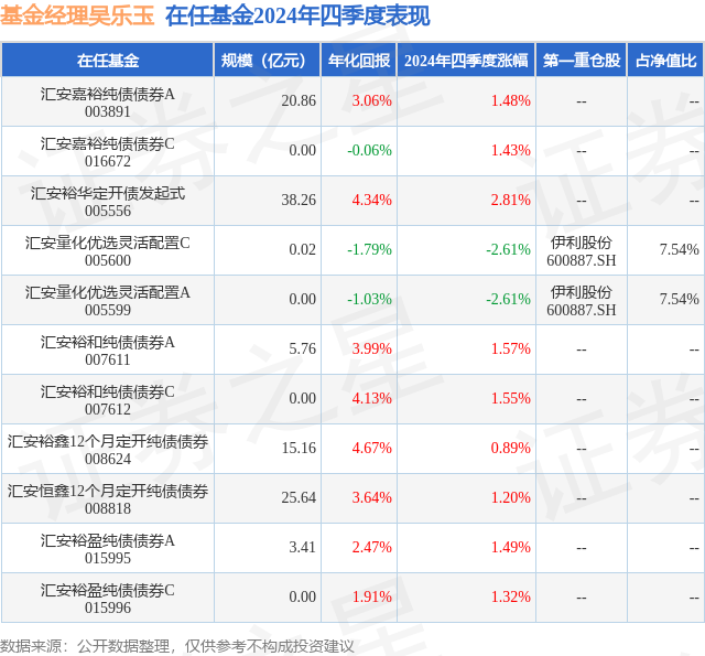 从基金规模来看,汇安量化优选灵活配置C基金2024年四季度公布的基金规模为0.02亿元,较上一期规模259.0万元变化了-18.81万元,环比变化了-7.26%。该基金最新一期资产配置为:股票占净值比65.34%,无债券类资产,现金占净值比13.18%。从基金持仓来看,该基金当季前十大股票仓位达46.9%,第一大重仓股为伊利股份(600887),持仓占比为7.54%。