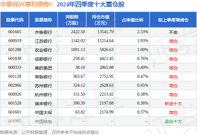 从基金规模来看,华泰保兴尊利债券C基金2024年四季度公布的基金规模为8.06亿元,较上一期规模5.22亿元变化了2.84亿元,环比变化了54.34%。该基金最新一期资产配置为:股票占净值比16.32%,债券占净值比83.25%,现金占净值比1.04%。从基金持仓来看,该基金当季前十大股票仓位达8.56%,第一大重仓股为齐鲁银行(601665),持仓占比为2.33%。