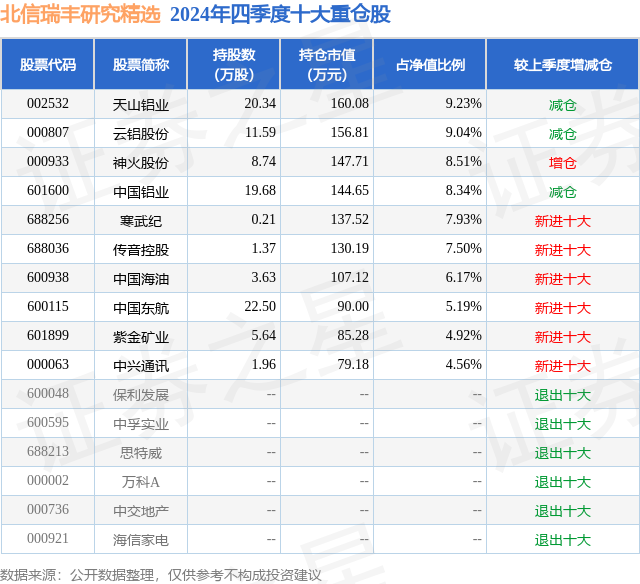 从基金规模来看,北信瑞丰研究精选基金2024年四季度公布的基金规模为0.17亿元,较上一期规模3586.37万元变化了-1851.53万元,环比变化了-51.63%。该基金最新一期资产配置为:股票占净值比91.58%,无债券类资产,现金占净值比10.71%。从基金持仓来看,该基金当季前十大股票仓位达71.39%,第一大重仓股为天山铝业(002532),持仓占比为9.23%。