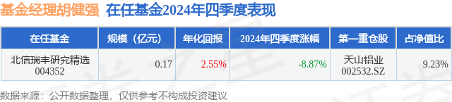 证券之星消息,日前北信瑞丰研究精选基金公布四季报,2024年四季度最新规模0.17亿元,季度净值涨幅为-8.87%。