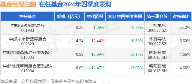 证券之星消息,日前中邮未来新蓝筹混合基金公布四季报,2024年四季度最新规模4.24亿元,季度净值涨幅为-10.39%。