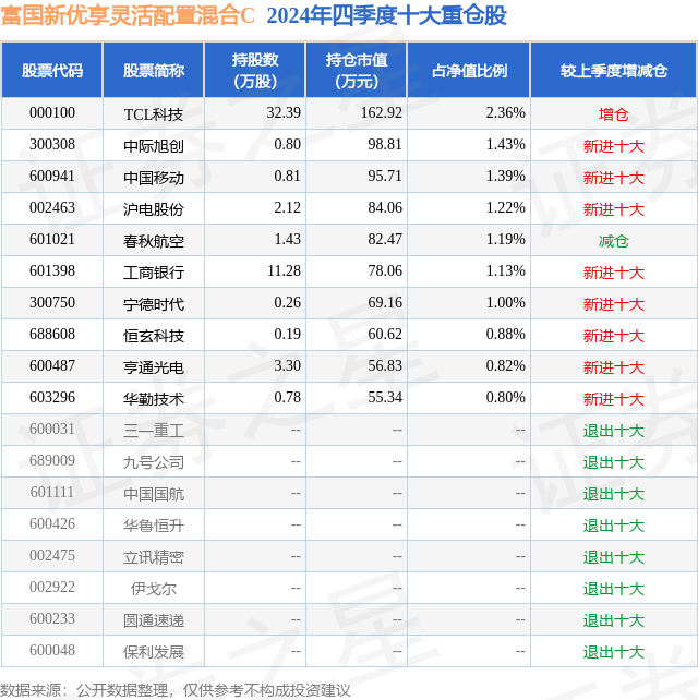 证券之星消息,日前富国新优享灵活配置混合C基金公布四季报,2024年四季度最新规模0.13亿元,季度净值涨幅为-1.28%。