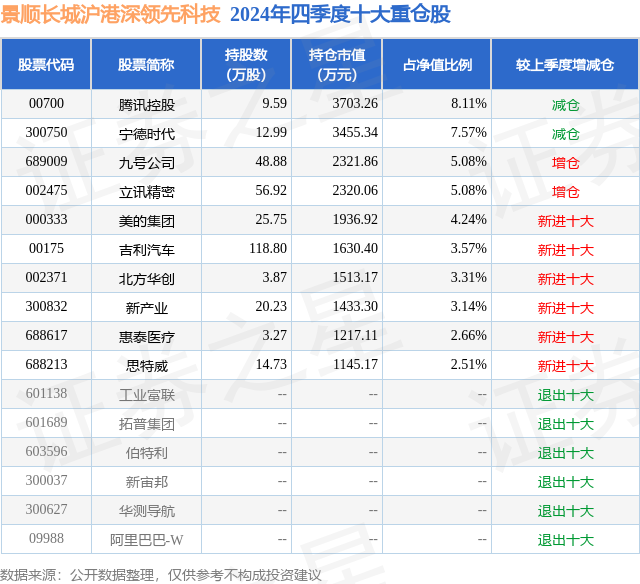 证券之星消息,日前景顺长城沪港深领先科技基金公布四季报,2024年四季度最新规模4.57亿元,季度净值涨幅为-0.8%。
