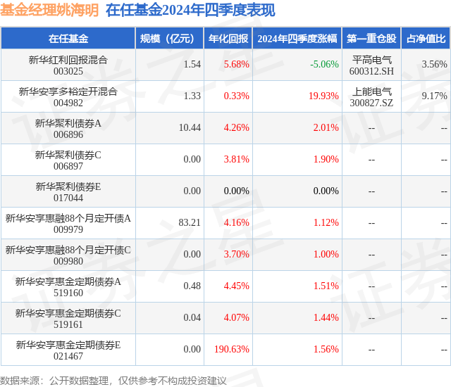 新华红利回报混合现任基金经理为姚海明。其中在任基金经理姚海明已从业4年又59天,2021年12月30日正式接手管理新华红利回报混合,任职期间累计回报为-15.19%。目前还管理着10只基金产品(包括A类和C类),其中本季度表现最佳的基金为新华安享多裕定开混合(004982),季度净值涨幅为19.93%。