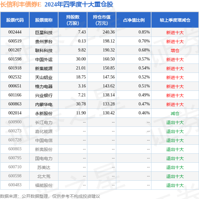 证券之星消息,日前长信利丰债券E基金公布四季报,2024年四季度最新规模0.0亿元,季度净值涨幅为0.93%。