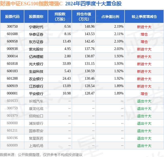 从基金规模来看,财通中证ESG100指数增强C基金2024年四季度公布的基金规模为0.0亿元,较上一期规模0.0万元变化了0.0万元,环比变化了nan%。该基金最新一期资产配置为:股票占净值比93.72%,无债券类资产,现金占净值比7.15%。从基金持仓来看,该基金当季前十大股票仓位达19.91%,第一大重仓股为宁德时代(300750),持仓占比为2.19%。