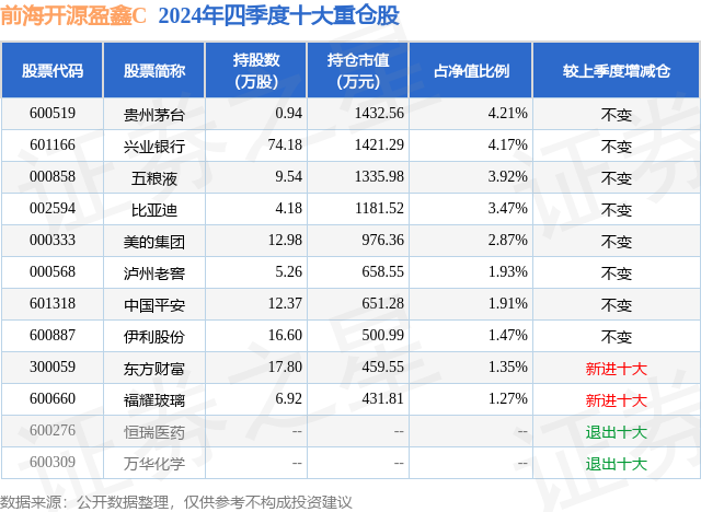 从基金规模来看,前海开源盈鑫C基金2024年四季度公布的基金规模为3.37亿元,较上一期规模3.44亿元变化了-720.81万元,环比变化了-2.1%。该基金最新一期资产配置为:股票占净值比45.36%,债券占净值比33.03%,现金占净值比21.64%。从基金持仓来看,该基金当季前十大股票仓位达26.57%,第一大重仓股为贵州茅台(600519),持仓占比为4.21%。