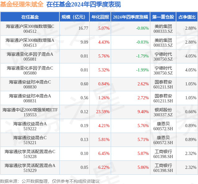 海富通沪深300指数增强A现任基金经理为朱斌全 林立禾。其中在任基金经理朱斌全已从业6年又57天,2019年10月15日正式接手管理海富通沪深300指数增强A,任职期间累计回报为26.29%。目前还管理着11只基金产品(包括A类和C类),其中本季度表现最佳的基金为海富通中证2000增强策略ETF(159553),季度净值涨幅为9.4%。