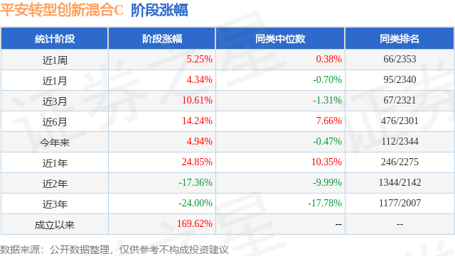 从业绩表现来看,平安转型创新混合C基金过去一年净值涨幅为24.85%,在同类基金中排名246/2275,同类基金过去一年净值涨幅中位数为10.35%。而基金过去一年的最大回撤为-21.69%,成立以来的最大回撤为-50.87%。