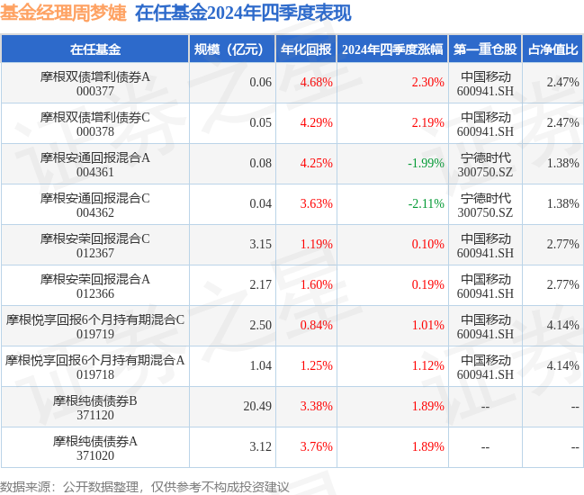 证券之星消息,日前摩根安通回报混合A基金公布四季报,2024年四季度最新规模0.08亿元,季度净值涨幅为-1.99%。