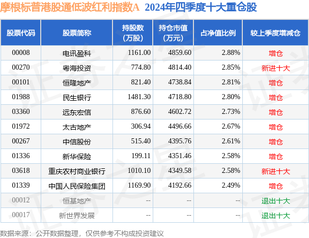 证券之星消息,日前摩根标普港股通低波红利指数A基金公布四季报,2024年四季度最新规模9.02亿元,季度净值涨幅为2.49%。