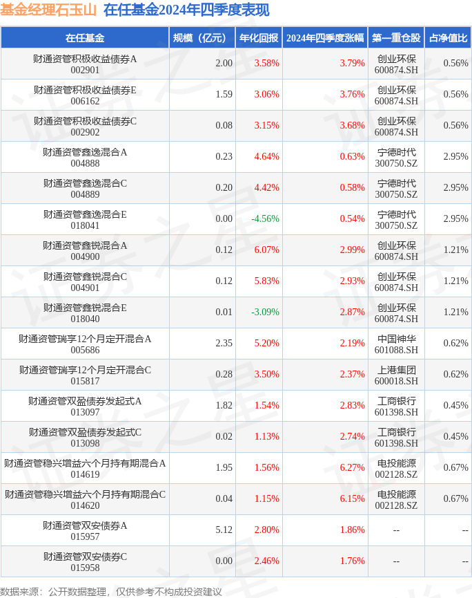 从基金规模来看,财通资管鑫锐混合A基金2024年四季度公布的基金规模为0.12亿元,较上一期规模2123.46万元变化了-905.72万元,环比变化了-42.65%。该基金最新一期资产配置为:股票占净值比29.51%,债券占净值比69.32%,现金占净值比34.93%。从基金持仓来看,该基金当季前十大股票仓位达9.31%,第一大重仓股为创业环保(600874),持仓占比为1.21%。