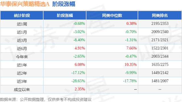 从业绩表现来看,华泰保兴策略精选A基金过去一年净值涨幅为6.08%,在同类基金中排名1635/2275,同类基金过去一年净值涨幅中位数为10.35%。而基金过去一年的最大回撤为-22.37%,成立以来的最大回撤为-49.92%。
