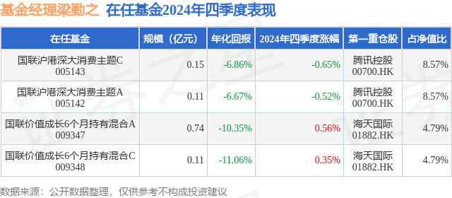 国联沪港深大消费主题C现任基金经理为梁勤之。其中在任基金经理梁勤之已从业0年又86天,2024年12月31日正式接手管理国联沪港深大消费主题C,任职期间累计回报为-1.69%。目前还管理着4只基金产品(包括A类和C类),其中本季度表现最佳的基金为国联价值成长6个月持有混合A(009347),季度净值涨幅为0.56%。