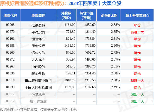 从基金规模来看,摩根标普港股通低波红利指数C基金2024年四季度公布的基金规模为7.85亿元,较上一期规模5.41亿元变化了2.44亿元,环比变化了45.12%。该基金最新一期资产配置为:股票占净值比93.32%,无债券类资产,现金占净值比7.3%。从基金持仓来看,该基金当季前十大股票仓位达27.0%,第一大重仓股为电讯盈科(00008),持仓占比为2.88%。