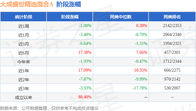 从业绩表现来看,大成盛世精选混合A基金过去一年净值涨幅为17.09%,在同类基金中排名666/2275,同类基金过去一年净值涨幅中位数为10.35%。而基金过去一年的最大回撤为-12.24%,成立以来的最大回撤为-32.64%。