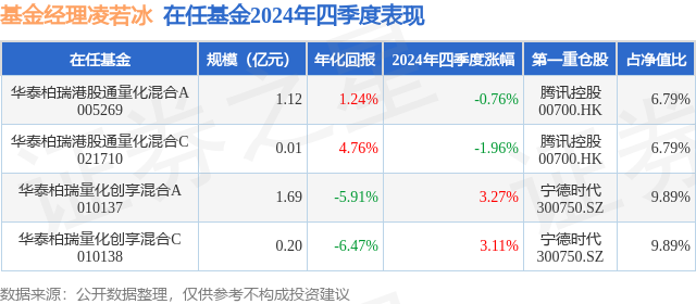 华泰柏瑞港股通量化混合A现任基金经理为凌若冰,近期离任的基金经理为盛豪。其中在任基金经理凌若冰已从业3年又130天,2021年9月17日正式接手管理华泰柏瑞港股通量化混合A,任职期间累计回报为4.42%。目前还管理着4只基金产品(包括A类和C类),其中本季度表现最佳的基金为华泰柏瑞量化创享混合A(010137),季度净值涨幅为3.27%。