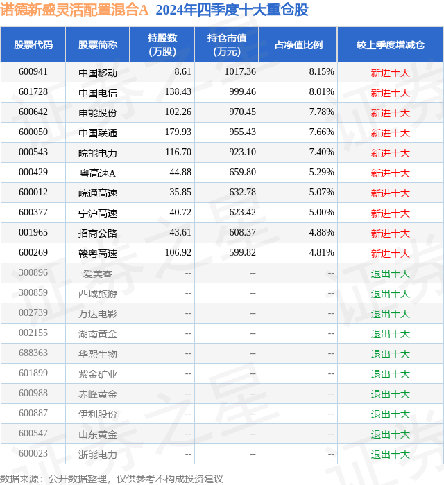 从基金规模来看,诺德新盛灵活配置混合A基金2024年四季度公布的基金规模为0.03亿元,较上一期规模425.82万元变化了-80.41万元,环比变化了-18.88%。该基金最新一期资产配置为:股票占净值比68.8%,无债券类资产,现金占净值比31.52%。从基金持仓来看,该基金当季前十大股票仓位达64.05%,第一大重仓股为中国移动(600941),持仓占比为8.15%。