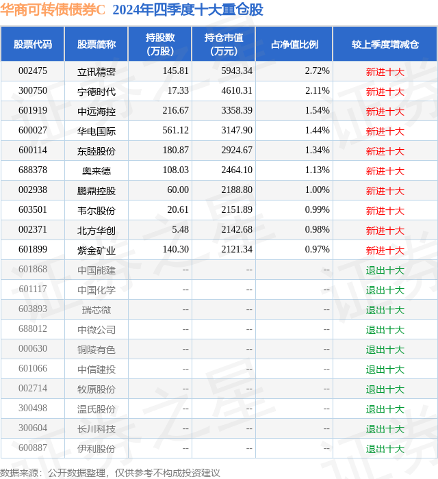 证券之星消息,日前华商可转债债券C基金公布四季报,2024年四季度最新规模7.08亿元,季度净值涨幅为-1.99%。