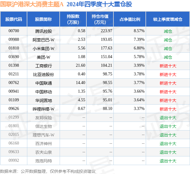 证券之星消息,日前国联沪港深大消费主题A基金公布四季报,2024年四季度最新规模0.11亿元,季度净值涨幅为-0.52%。