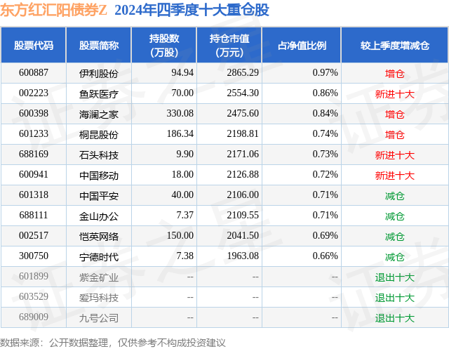 证券之星消息,日前东方红汇阳债券Z基金公布四季报,2024年四季度最新规模0.19亿元,季度净值涨幅为0.7%。