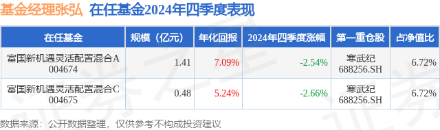 从基金规模来看,富国新机遇灵活配置混合A基金2024年四季度公布的基金规模为1.41亿元,较上一期规模2.1亿元变化了-6871.84万元,环比变化了-32.71%。该基金最新一期资产配置为:股票占净值比84.38%,债券占净值比0.32%,现金占净值比15.81%。从基金持仓来看,该基金当季前十大股票仓位达41.08%,第一大重仓股为寒武纪(688256),持仓占比为6.72%。