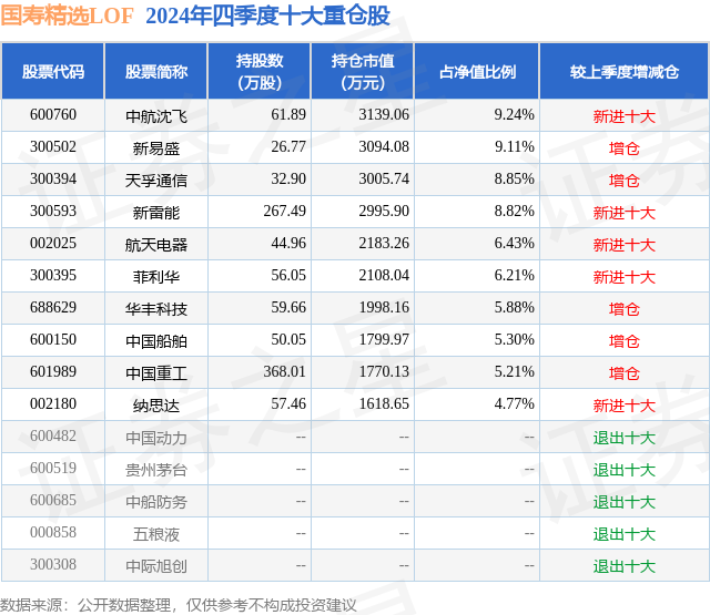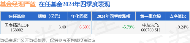从基金规模来看,国寿精选LOF基金2024年四季度公布的基金规模为3.4亿元,较上一期规模2.05亿元变化了1.34亿元,环比变化了65.51%。该基金最新一期资产配置为:股票占净值比89.86%,债券占净值比6.53%,现金占净值比2.94%。从基金持仓来看,该基金当季前十大股票仓位达69.82%,第一大重仓股为中航沈飞(600760),持仓占比为9.24%。