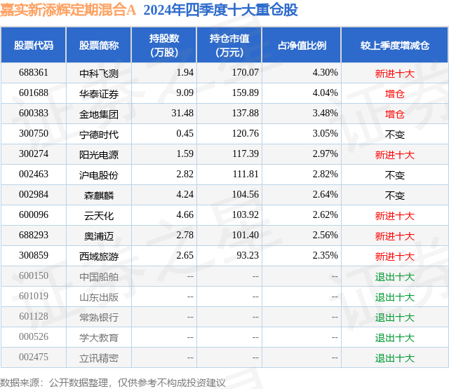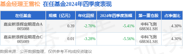证券之星消息,日前嘉实新添辉定期混合A基金公布四季报,2024年四季度最新规模0.39亿元,季度净值涨幅为-5.41%。
