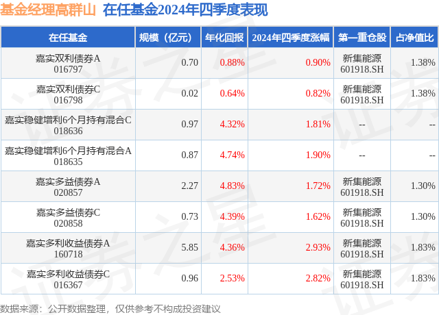 从基金规模来看,嘉实多利收益债券A基金2024年四季度公布的基金规模为5.85亿元,较上一期规模10.7亿元变化了-4.85亿元,环比变化了-45.34%。该基金最新一期资产配置为:股票占净值比16.24%,债券占净值比81.67%,现金占净值比3.31%。从基金持仓来看,该基金当季前十大股票仓位达8.92%,第一大重仓股为新集能源(601918),持仓占比为1.83%。