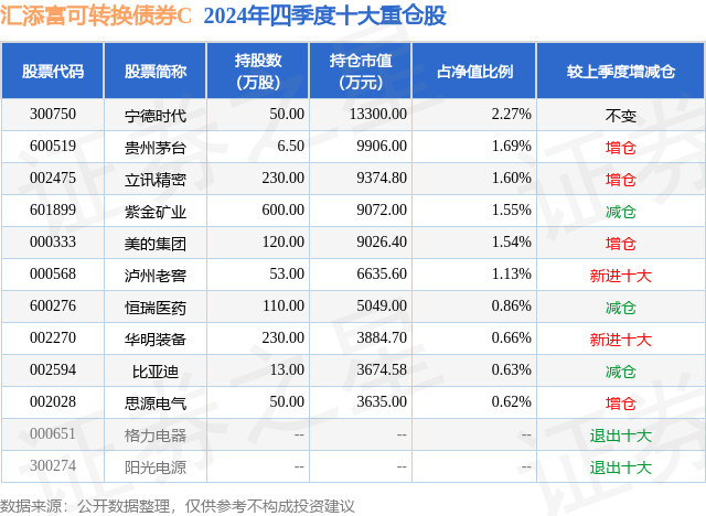 从基金规模来看,汇添富可转换债券C基金2024年四季度公布的基金规模为8.85亿元,较上一期规模6.02亿元变化了2.83亿元,环比变化了46.93%。该基金最新一期资产配置为:股票占净值比17.37%,债券占净值比90.05%,现金占净值比1.28%。从基金持仓来看,该基金当季前十大股票仓位达12.55%,第一大重仓股为宁德时代(300750),持仓占比为2.27%。
