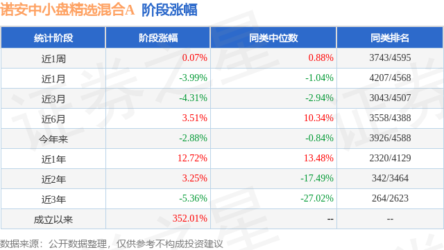 从业绩表现来看,诺安中小盘精选混合A基金过去一年净值涨幅为12.72%,在同类基金中排名2320/4129,同类基金过去一年净值涨幅中位数为13.48%。而基金过去一年的最大回撤为-13.36%,成立以来的最大回撤为-41.35%。