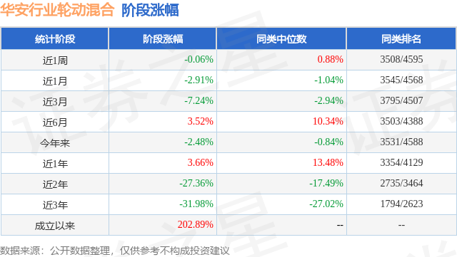 从业绩表现来看,华安行业轮动混合基金过去一年净值涨幅为3.66%,在同类基金中排名3354/4129,同类基金过去一年净值涨幅中位数为13.48%。而基金过去一年的最大回撤为-15.38%,成立以来的最大回撤为-52.41%。